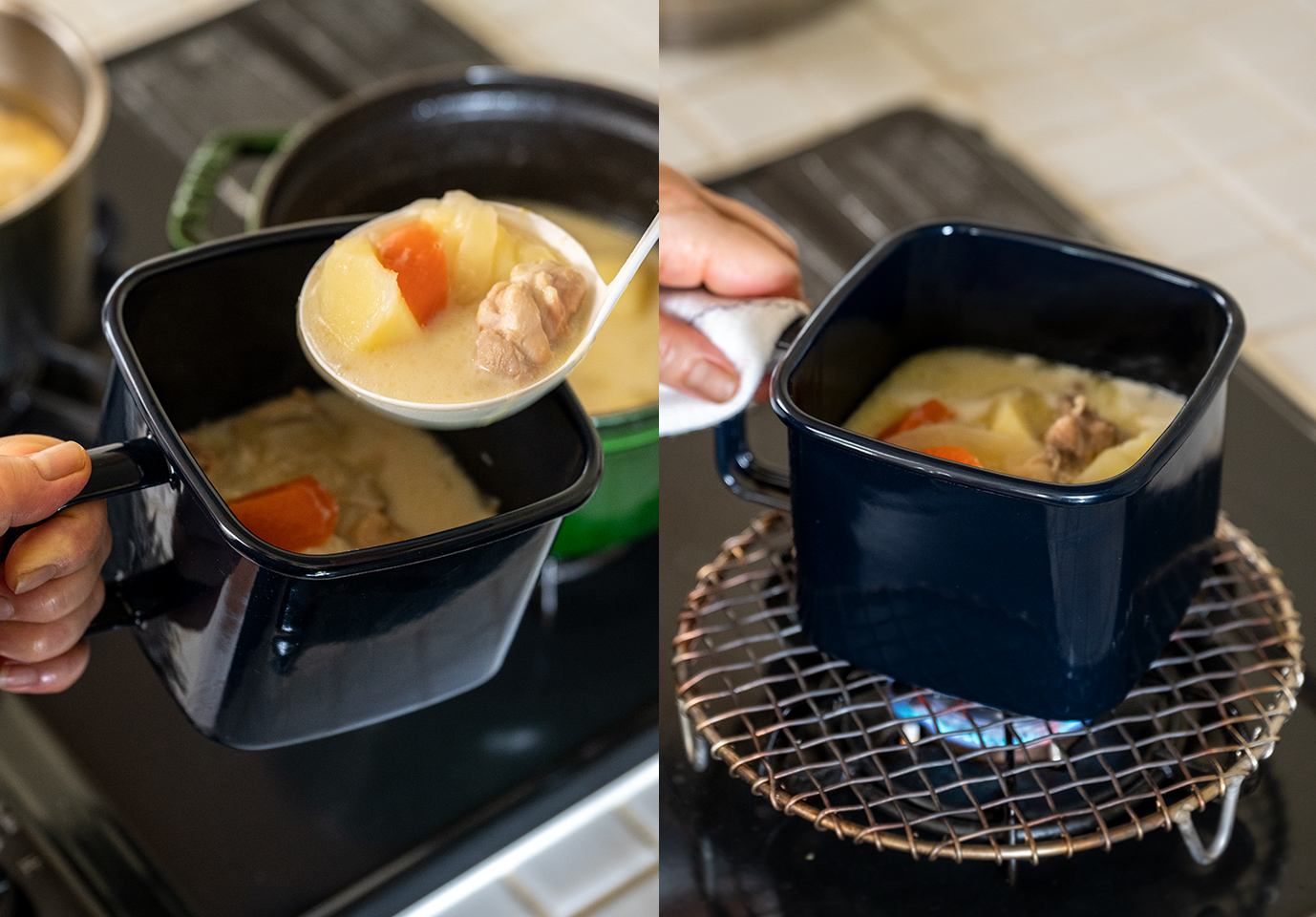 琺瑯はその特質上、そのまま火にかけて温めたり、オーブンに入れたりすることができます。熱伝導率が良いので、保存したお惣菜を温めなおしたり、冷凍しておいたものを解凍して調理するのにも向いています。