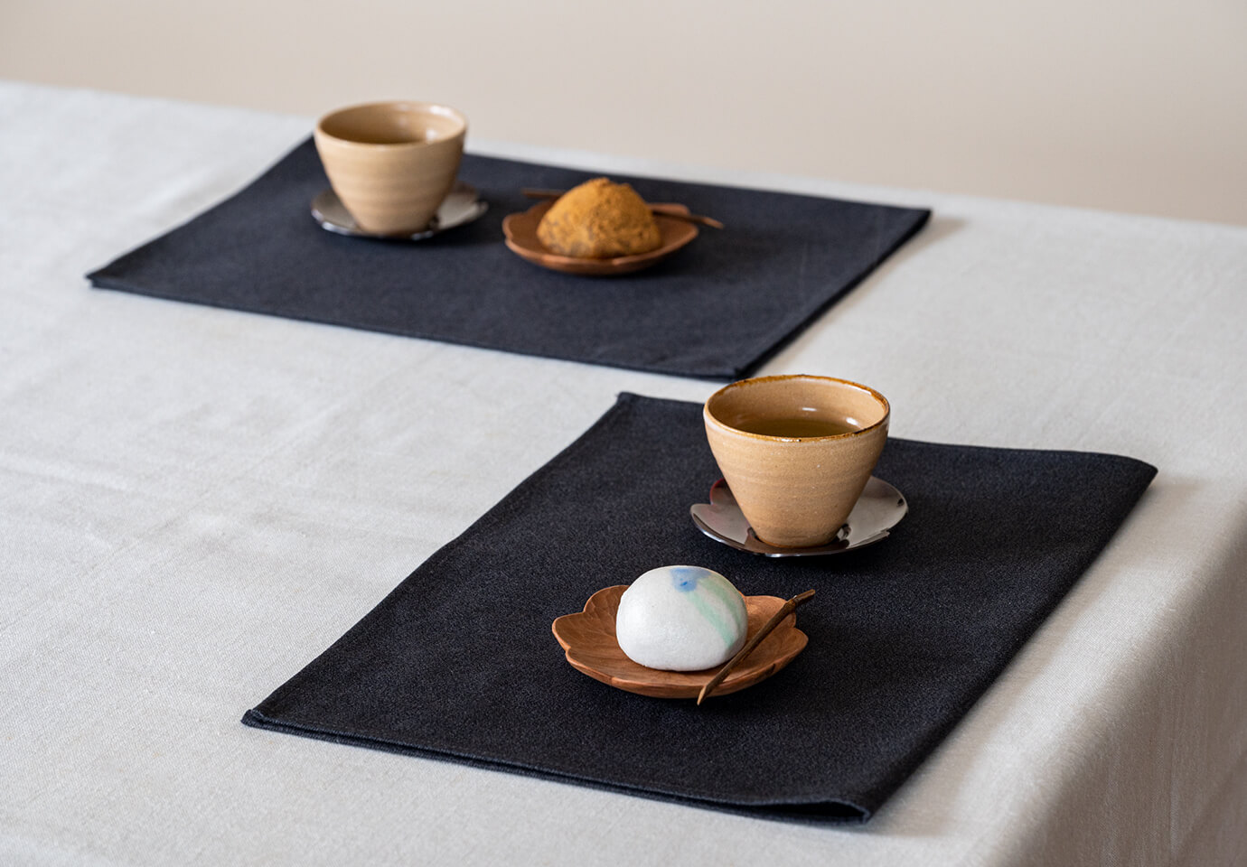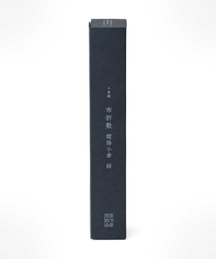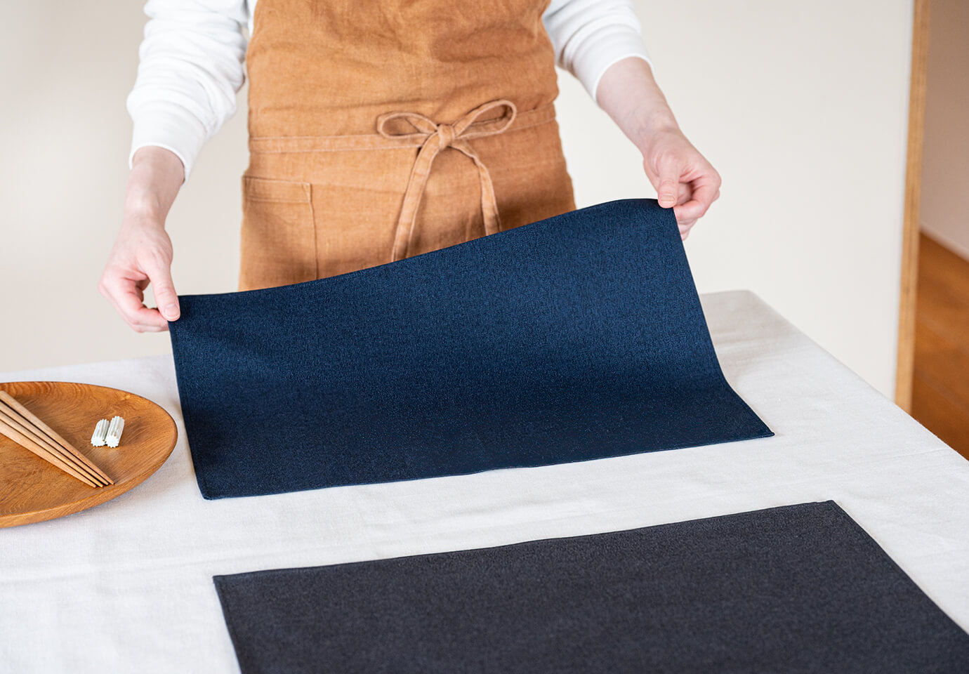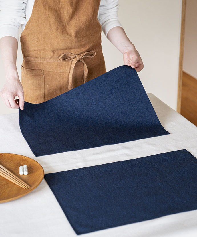 茅乃舎はじまりの地である福岡の、東部にある城下町・小倉。その名産品のひとつ、小倉織の生地「霜降小倉」で、紺と灰の2色の布折敷を仕立てました。明治期の学生服にも重宝された、しなやかでいて艶のある風合いが食卓に品格をにじませます。