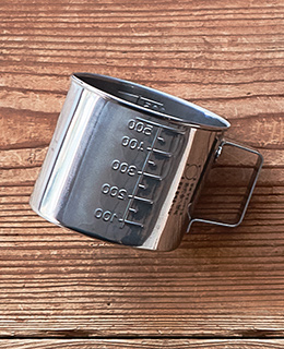 茅乃舎のだしをとる時に重宝するメジャーカップです。50ml刻みの目盛りがついている仕様が便利。丈夫なステンレス製ですのでお手入れがしやすく、におい移りも少ないため、長くご愛用いただけます。「茅乃舍ノ道具」ロゴをさりげなくあしらいました。