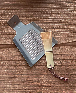 1792年創業の日本橋木屋製。薬味おろしは新潟、薬味寄せは奈良で作られています。銅製のおろしは、程良く水分を残し、きめ細かく口当たりのよい「おろし」を作ることができます。薬味おろしの目詰まりを落とす「薬味寄せ」は、茶せんを基に作られた淡竹製です。生姜やにんにくなどの薬味や、柑橘類の皮を擦るのに最適です。