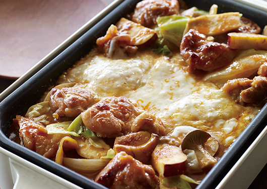 - 2. ホットプレートに油を入れて熱し、鶏肉を漬け込んだ液ごと入れて焼く。さらに野菜を加えて、蓋をして火を通す。