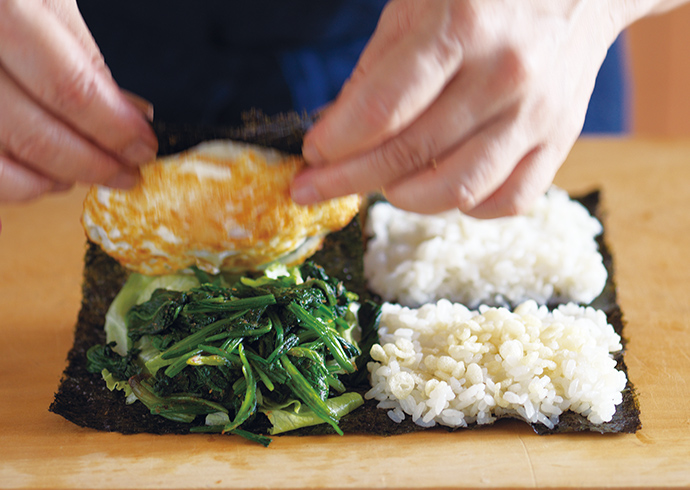 朝ごはんといえばの卵を野菜と一緒におにぎりにすると栄養たっぷり、バランスも良好。だし炊きごはんでつくればぐっと滋味深いおいしさに。