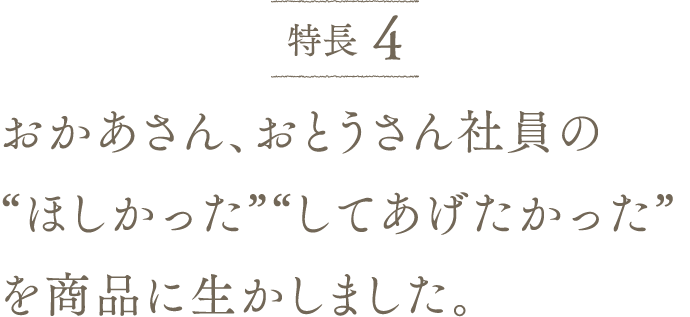 おとうさん社員の意見を取り入れて開発した商品です。我が子を思う親ごころが詰まっています。