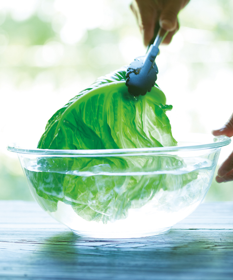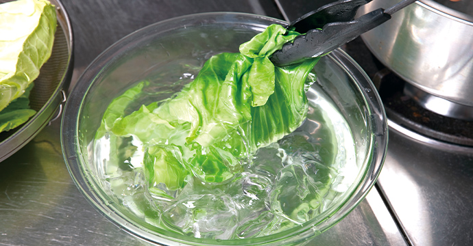 キャベツの葉を氷水に浸すことで、黄緑色が映え、美しい色に保つことができます。見た目も美味しさのひとつですので、せっかくなら、ひとてまをかけてみましょう。