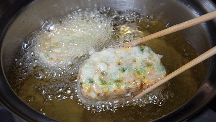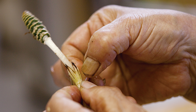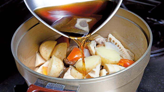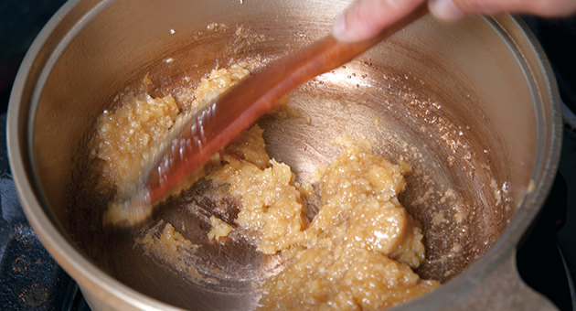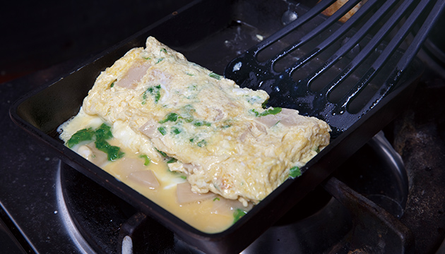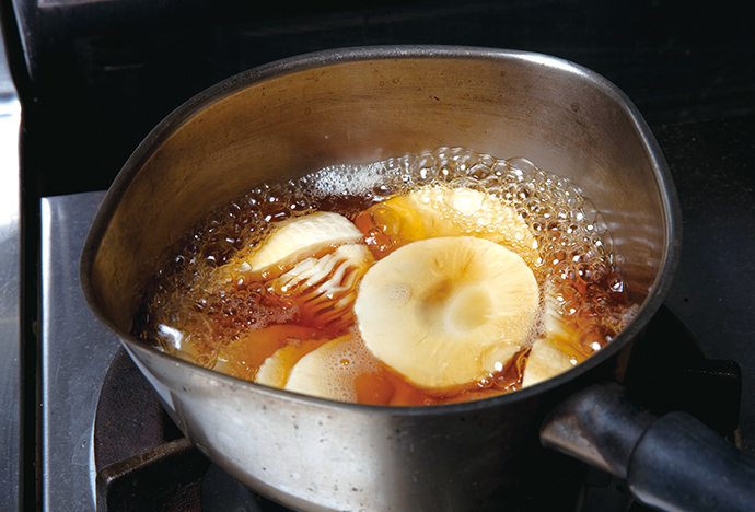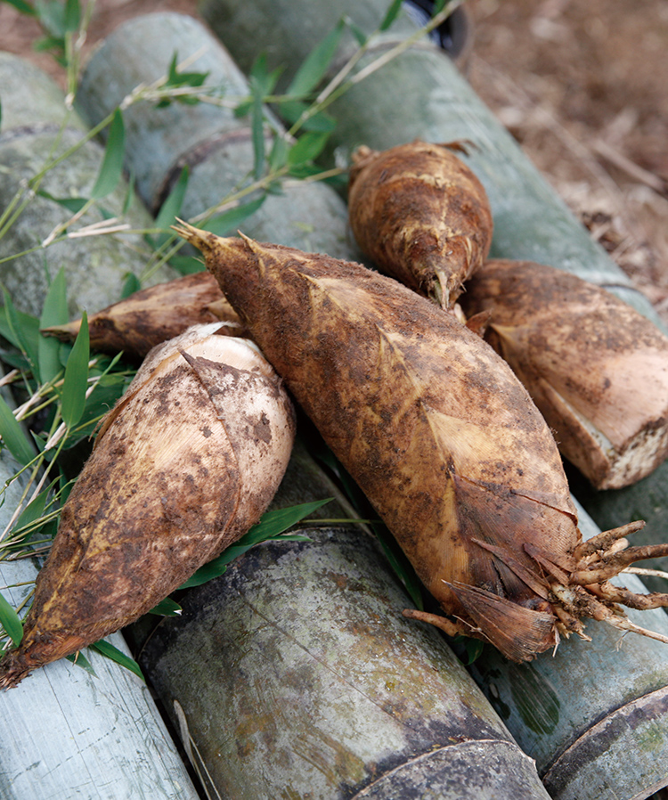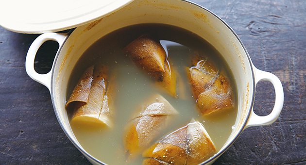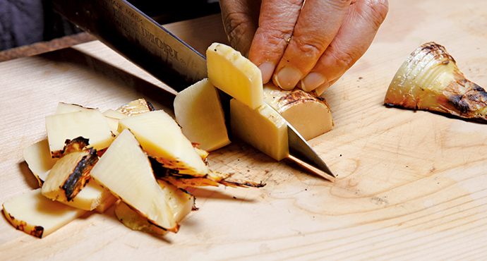 下茹でした筍は、このままでも充分おいしいですが、炙るというひと手間で、一味違う味わいになります。網にのせ、ガスコンロで焦げ目がつくまでじっくりと炙ることで茹で筍にはない甘みやうまみを醸し出します。