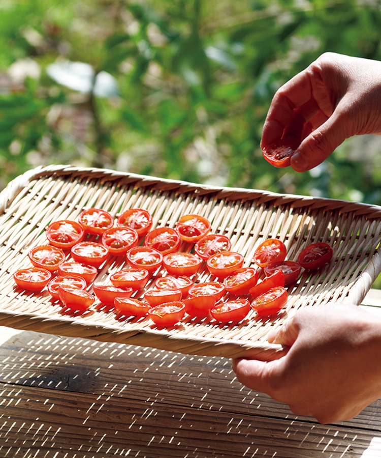 2~3時間経つと、ミニトマトの赤が濃くなり、切り口がすこし乾いてきます。全体的にはフレッシュ感を残したまま。天日干しが難しい場合は、200℃に熱したオーブンやトースターで5~10分加熱しても同じようにできあがります。