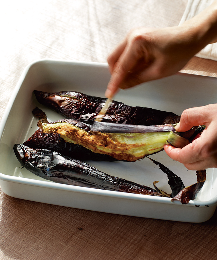 焼き茄子は丸ごと焼き網にのせて強火で焦げるまで焼くのがおすすめです。焼けたら、できるだけ熱々のうちに皮を剥きましょう。水につけると茄子が水っぽくなり味が落ちるので、熱いままヘタ部分の皮を竹串ですくい取り、花つき(おしり)に向かってひっぱるように皮を剥きます。