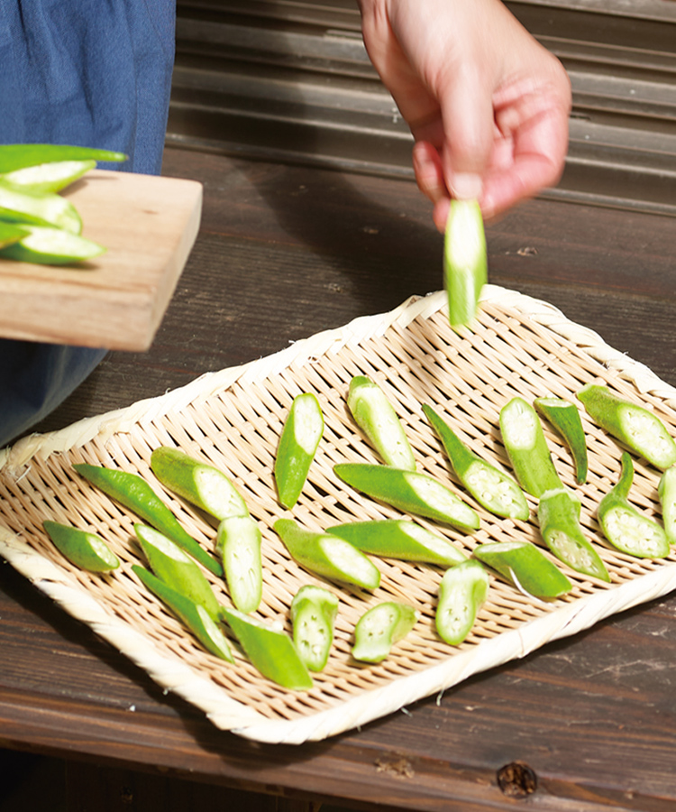 オクラを2~3時間干すと水分が抜けてうまみが凝縮され、甘みや香りも引き立ちます。おいしいひと手間を楽しみましょう。