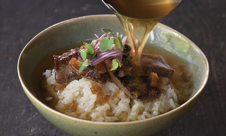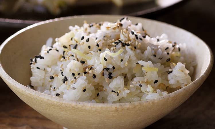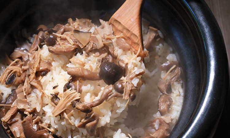 収穫したて、みずみずしさが残る新米ならば、やっぱり炊き立ての白御飯がお好きでしょうか。ただ、ちょっと目先を変えて、もっと楽しく、新米を味わいつくす方法を茅乃舎は知っています。それが「だし炊き御飯」です。いただく時に、うまみと香りをふんわり感じるくらいのだしがいい塩梅で、お米のおいしさを支えます。この秋から、我が家の定番になりますように。