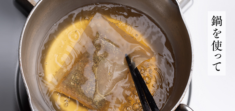 鍋にだしパック1袋と水200mlを入れてだしパック全体に水が染み込むように箸で揺らし、火にかけます。沸騰後、中火で4~5分煮出し、だしパックを取り出します。
