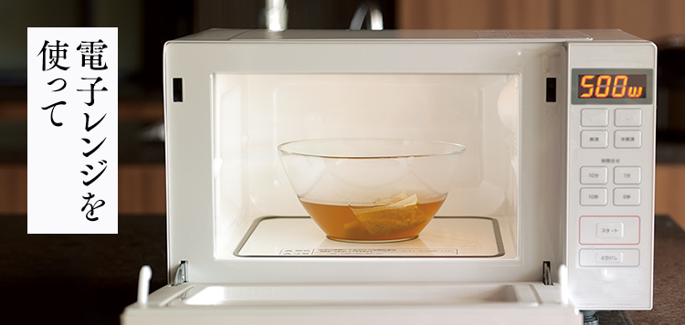 耐熱ボウルに、だしパック1袋と水 150mlを入れて、だしパックの全体に水が染み込むよう箸で揺らします。ラップ等はかけずに 500Wの電子レンジで5分温め、だしパックを取り出します。