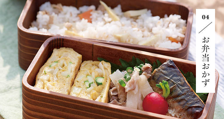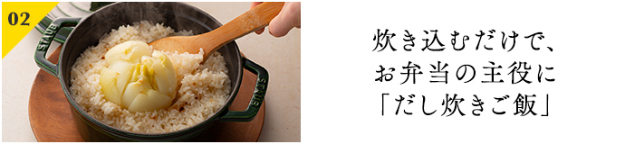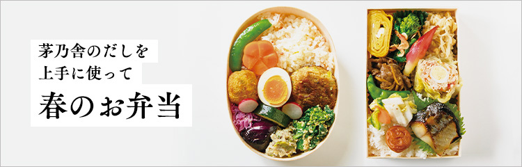 茅乃舎のだしとお好きな具材を一緒に炊き込むだけで、味も具材もしっかりした主役ごはんが出来上がります。春の彩りや食材で、お弁当の中が華やかになります。