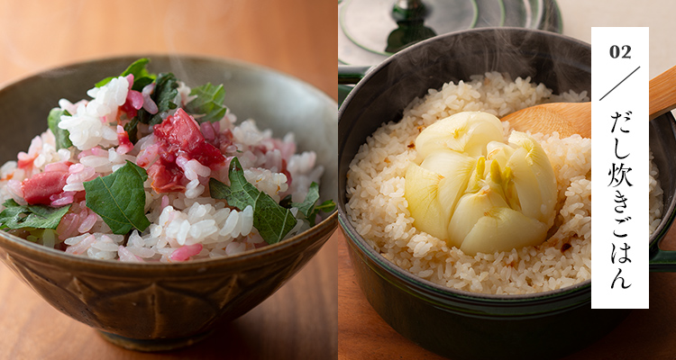 梅と大葉の爽やかな風味と彩りが春にぴったりです。茅乃舎だしのうまみが具材のおいしさを引き立てます。