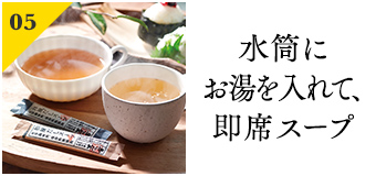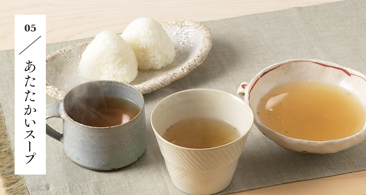 お茶の代わりに、あたたかいスープはいかがですか。茅乃舎ではお湯を注ぐだけでおいしい、フリーズドライ商品をご用意しています。