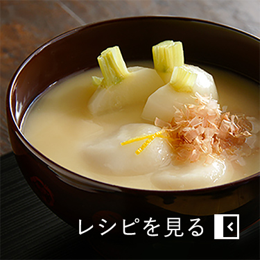 仙台の雑煮といえば、焼きハゼが丸ごと入ったものが知られていますが、焼きハゼを使わなくても、凍み豆腐、笹かまぼこ、いくら、せりなどを具材にすると、仙台風の雑煮に。茅乃舎だしと椎茸だしを合わせた奥行きのある味わいが、よく合います。