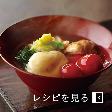 - 3. 2に1を加え、具材に火が通ったら、焼いた餅とともに椀に盛り、食べやすい大きさに切った三つ葉を添える。