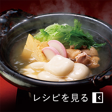 - 3. 2に1を加えて弱火にかけ、鶏肉に火が通ったらかまぼこを加えて軽く煮る。焼いた餅とともに椀に盛り、三つ葉を添える。