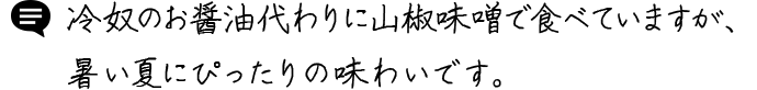 まず味わってほしいのは、ご飯のお供として。ピリリと山椒の爽やかな香りが鼻を抜け、もう一口もう一口とご飯が進みます。たいへん素朴ながら、幸せに満ちた食卓。汁ものの薬味としてもお役立てください。