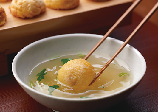 ポイントは卵白とパン粉を肉だねに加えること。ふわっと軽い仕上がりに。 茅乃舎 鶏ほたてだしがうまみをプラスしてくれます。