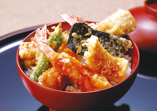 江戸近海でとれた魚介を味わう江戸前天丼は、ごま油でこんがりきつね色に揚げた天ぷらと、とろっとした濃いめのたれが特徴。