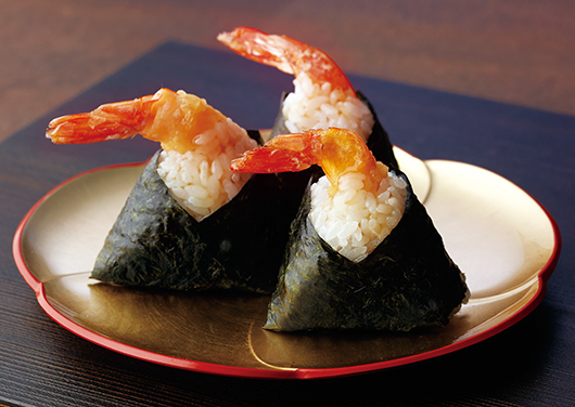 海老天を具にした小ぶりのおむすび。だしがきいた甘辛のたれが衣にしっとり染みた海老天と、海苔で包んだごはんの相性は抜群。もう一個、もう一個と、手が伸びてしまいます。