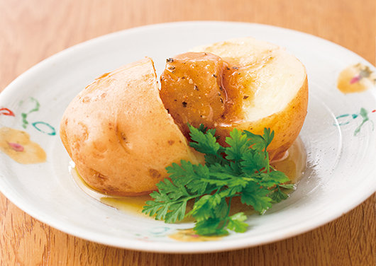 ほくほくのじゃがいもにバターがとろ~り。バターに北海道限定 茅乃舎えびだしの香ばしさが加わると、お箸が止まらないおいしさに。おやつにも良さそうな子どもも喜ぶ一品です。