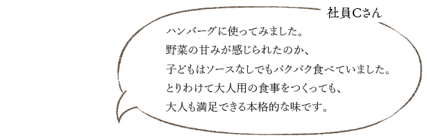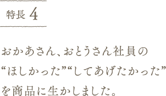 離乳食づくりを経験したおかあさん、おとうさん社員の意見を取り入れて開発した商品です。我が子を思う親ごころが詰まっています。