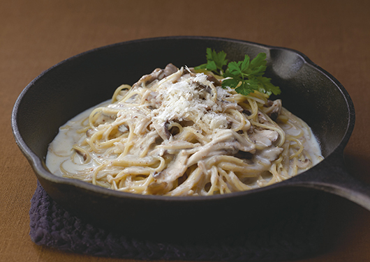 麺に、だしと茸のうま味がしっかり染み込み、食感がモチモチに仕上がります。