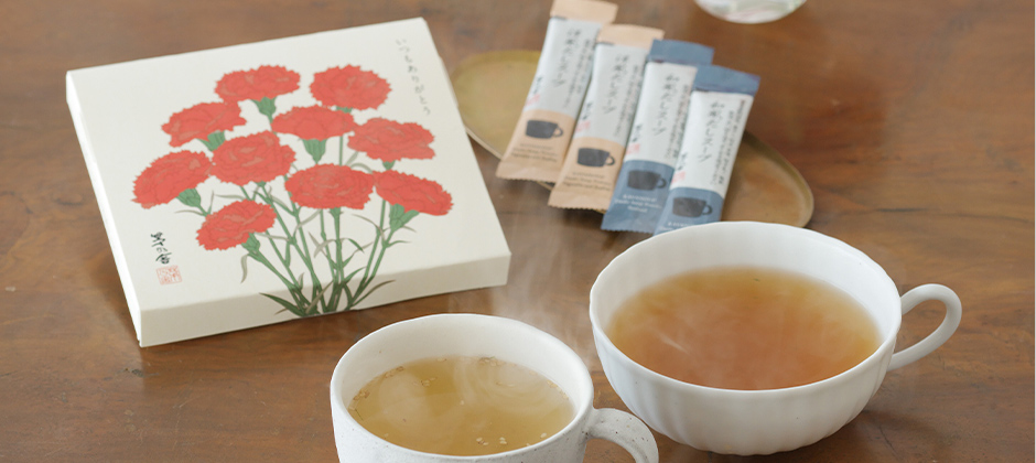 カーネーション(レッド/プラムタルト)と茅乃舎だしのギフトは、お花の上に仕切りを置き、その上にきんちゃくに入った茅乃舎だしを置いた状態でお届けいたします。