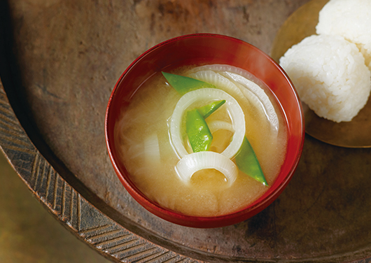 柔らかな新玉ねぎと、香りのよい絹さやで春いっぱいのお味噌汁に。茅乃舎だしがおいしさを支えます。