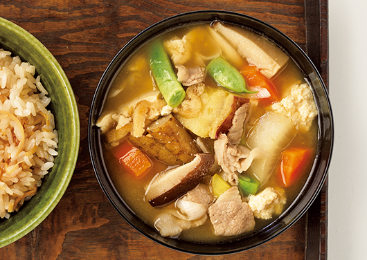 これ一杯あればおかずが不要になる、具だくさん豚汁。茅乃舎だしのうまみが具材のおいしさをまとめます。