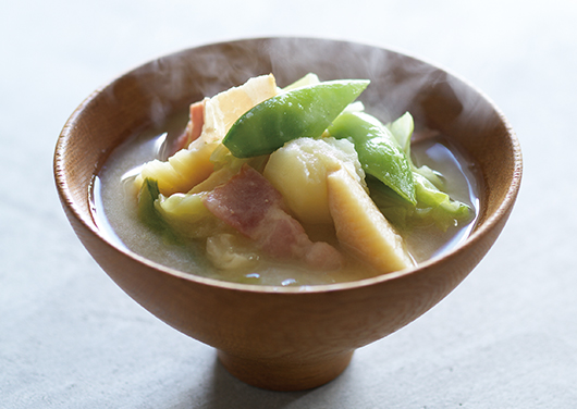 野菜もお肉も、具だくさんにつくる「おかず味噌汁」を、春の食材で。食べ応えある一杯だからごはんを添えるだけで一食になります。