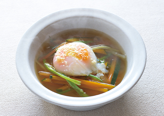 野菜を細切りにすると、食感が楽しくなります。どんな野菜でも代用OK。温泉卵を落とし栄養も備えれば、朝にいただきたいスープに。