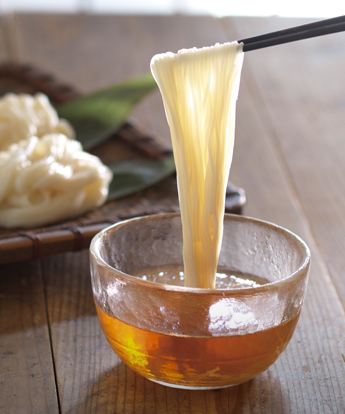 夏の定番もこだわりのおいしさで。国産小麦100%、 細くてしなやかな麺は、もっちりとしながらも、歯切れよく、なめらかです。