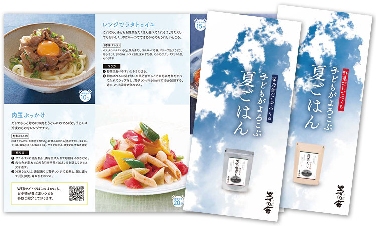 お子さんへ用意するごはんに、人気のチキンライスなど2人前を手軽に用意できる商品をセットにしました。弁当づくりにもお役立てください。茅乃舎だしと野菜だしには、20分以内でつくれる夏のレシピをご紹介したリーフレット付きです。