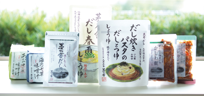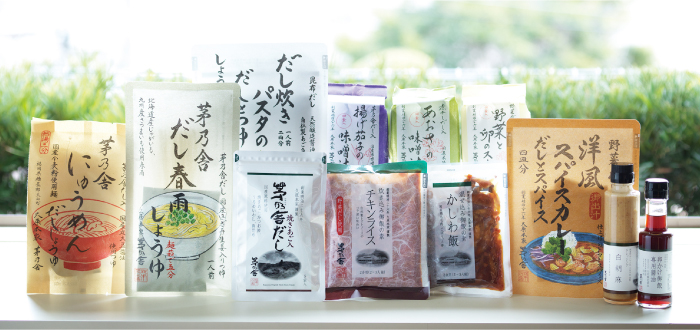 定番の「茅乃舎だし」には、はじめての自炊におすすめのレシピカード付き。簡単調理でだしのおいしさを生かす商品も揃え、忙しい日々の食生活を支えます。
