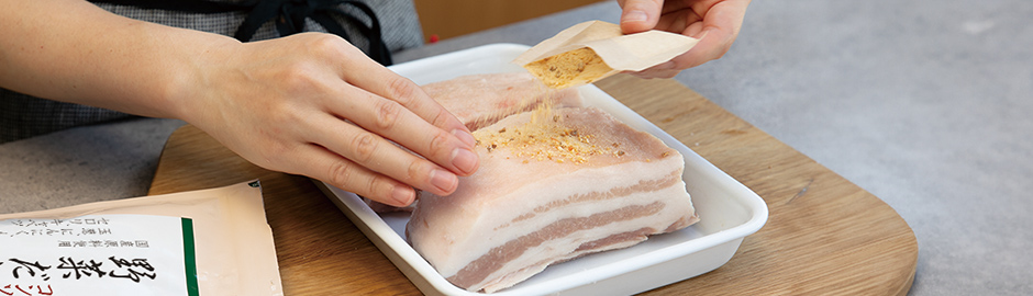 お肉やお魚の下味としてぜひ、茅乃舎のだしをご活用ください。使い方は、だしパックを「破って」すり込んでおくだけ。だしのうまみが食材をおいしく引き立ててくれます。料理に応じて調味料などで味を調えましょう。