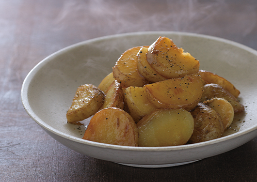 だしつゆやにんにくの風味をまとった、食べ応えあるバター炒め。じゃが芋のほか、里芋や長芋、アスパラ、鶏肉もおすすめです。