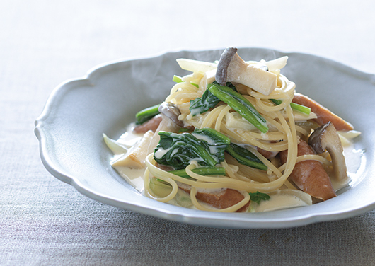 クリームパスタも、白だしを加えることで和風の味わいに。生クリームなしでつくれるレシピです。