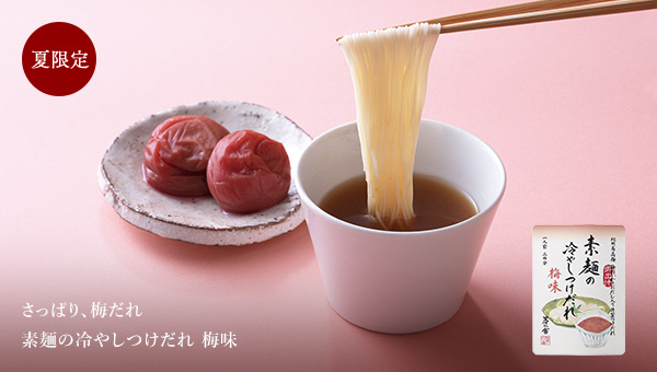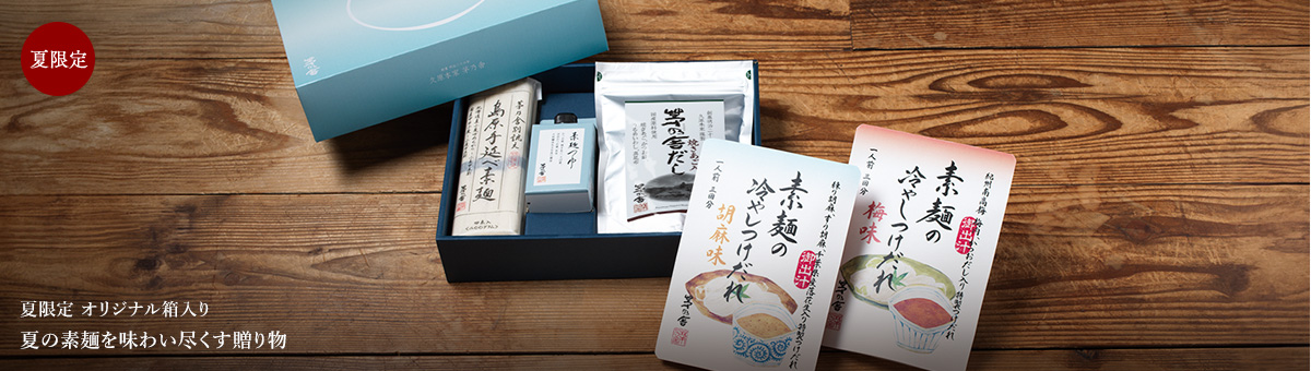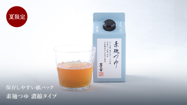 「素麺つゆ」を開発することになった時、料理人が作るように丁寧に、きちんとだしをとって調味した、素麺つゆに挑戦したいと思いました。そのためには、いかに濃く、だしを生かせるかが勝負でした。だし素材をできる限りふんだんに使うこと、雑節などを取り入れて多種のだし素材を使うこと。だしを際立たせたつゆづくりを追求したのです。素麺のつゆにここまでだしを豊かに使えるのも、茅乃舎ならではかもしれません。