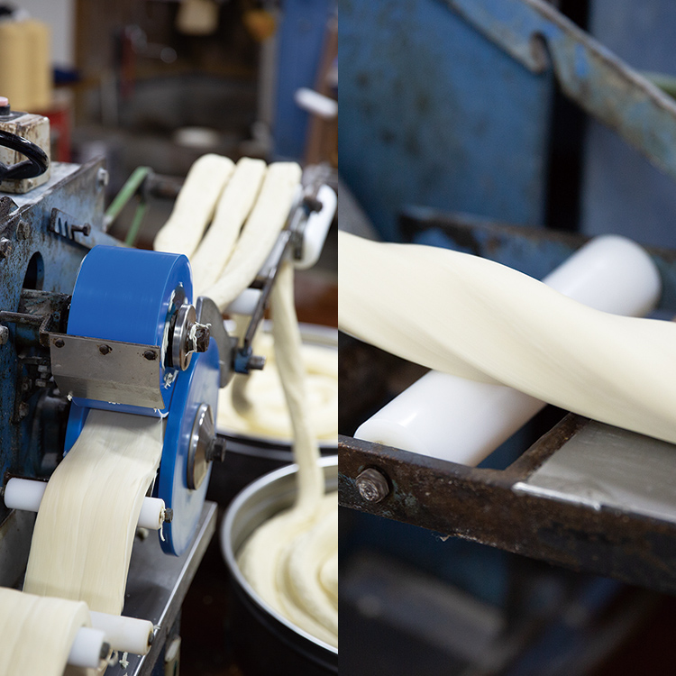空が明るみかける頃、カシャカシャ、カシャカシャとけたたましい音が製麺所に鳴り響きます。機織りを思わせるようなノスタルジックな音。ホース程の太さにまでなった麺を、今度は足踏みミシンのような機械にかけて、さらに細く仕上げていきます。スルスルと糸を巻くように機械をくぐり抜けながら、一本ずつ製麺。ここでもひねりを入れて、