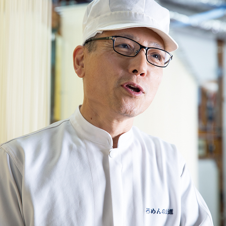 作り手が目で生地の状態を見ながら、手をかけ、寄り添いながら麺のお世話をすることが欠かせないのです。てまひまをかけて細く長い麵に延ばしていく。私たち手延べ職人の仕事は、昔も今も変わりません」。江戸時代から続く手延べの技とともに受け継いでいるのは、手延べ職人としての誇りと気概でした。