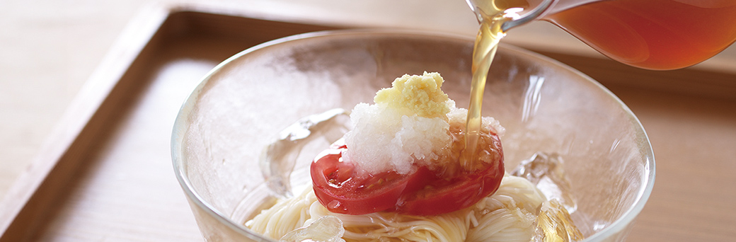 使用したのは、鰹節や焼きあご、昆布、宗田節、鯖節の5種。上質な素材で、ひとつひとつの抽出方法も工夫しています。その豊かな濃いだしに淡口醤油やみりんを加えて、すっきりした甘さの素麺つゆが完成しました。
