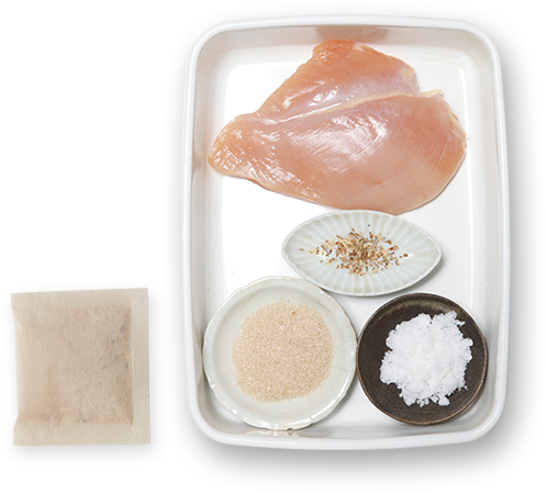 ボウルに茅乃舎だし、砂糖、塩、粉山椒を